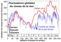 The eustatic theory is justified in regions that have been stable since the end of the Tertiary era, such as large sedimentary basins, and Nicolas Théobald applied it in his first work on the Moselle valley downstream of Thionville; he recognizes terraces at 90, 60, 40 and 15 meters above the low water level of the river and relates them to the four great glacial periods of the Quaternary.[23][24][25]
