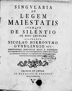 - Singularia ad legem maiestatis itemque de silentio in hoc crimine (in Latin). Frankfurt am Main: Johann Heinrich Gross. 1737.