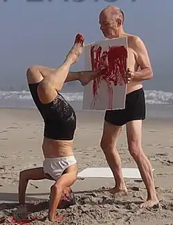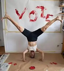 Since 2011, Nicole Peyrafitte has been working on an open-ended series of live performances which brings together her interests, preoccupations, and practices. The KARSTIC-Action Paintings explore proprioception (sense of body position) and kinesthesia (sense of body movement) as meeting points between painting, poetry, voice, and improvised music. Following her intuition, Peyrafitte investigates the thin line between her consciousness and unconsciousness, with a strong desire to reveal the immediate soul of that moment. Most often the markings on canvas are done with the feet, either in hand-stand or head-stand; each of these events is unique. Her "Action Paintings" have been showcased at the Galerie Simoncini in Luxembourg, at the Salon Zürcher in New York, and are part of the public collections of Musée Paul Valerie Sète, Musée National d’Histoire et d’Art Luxembourg, Bibliothèque du Luxembourg, Glasgow Women's Library Museum and Centre de National Literature du Luxembourg.[16]