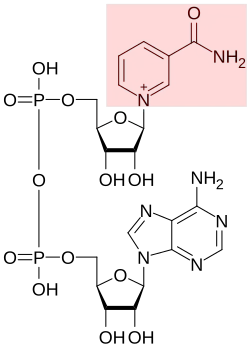 Nicotinamide occurs as a component of a variety of biological systems, including within the vitamin B family and specifically the vitamin B3 complex.[10][11] It is also a critically important part of the structures of NADH and NAD+, where the N-substituted aromatic ring in the oxidised NAD+ form undergoes reduction with hydride attack to form NADH.[33] The NADPH/NADP+ structures have the same ring, and are involved in similar biochemical reactions.