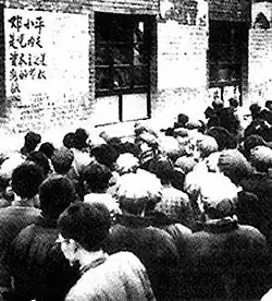 A week later, Mao Zedong ordered the poster to be read on the Central People's Broadcasting Station and published in the People's Daily, accompanied by official commentaries.[4][7] Two months later, Mao declared her poster as the "first Chinese Marxist-Leninist big-character poster".[4] Mao's approval encouraged attacks on authorities[7] and inspired students at other universities to write posters, most of which expressed support for the "revolutionary action" of Nie.[8]