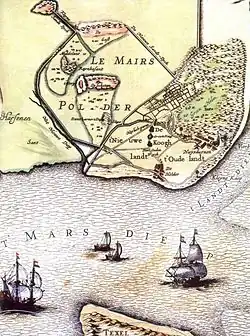 On 5 September 1781 orders were given to create a stone dam east of the Nieuwdiep that would guide the ebb flow for 348,500 guilders.[3] It was to be built in three parts (cf the map) The first part, the 'big stone and wood dam' (Groote Rijs en Steenen dam) was 475 meters long. The second part, a slate dam, Lijdam, was 655 m long. The third part, Keerdam, stretched east to catch the ebb flow and was 2260 m long. The second part was ready on schedule in June 1782. The delivery of the other parts was delayed by the difficulties in shipping the heavy stones required. In October 1782 the third part was finished, the first part following a few weeks later. Nevertheless, the first effects were shown when in August 1782 the bump in the mouth of the Nieuwediep was found to have been lowered by 1–1.5 feet. In October 1782 orders were then given to dredge out a way through the bump by December 1782. This became March 1783, but in April the depth had indeed reached over 19 feet, and some armed warships had already anchored in the harbor.[4]