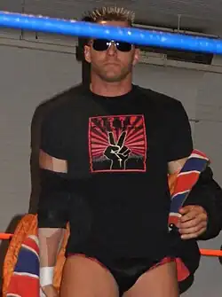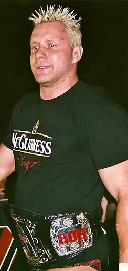 McGuinness debuted in Ring of Honor (ROH) on 9 August 2003, defeating Chet Jablonski.[10] He wrestled for ROH throughout 2004, but had limited success. In March 2005, McGuinness and Colt Cabana teamed together to challenge for the ROH Tag Team Championship, but lost to the incumbents, Dan Maff and B. J. Whitmer.[1] Cabana and McGuinness then began fighting one another, with McGuinness defeating Cabana on 7 May 2005, with an accidental low blow for a shot at the ROH Pure Championship. He challenged the champion, Samoa Joe, on 12 June 2005, but was defeated.[1] He faced Joe once more on 27 August, and defeated him to win the Pure Championship.[11]