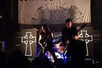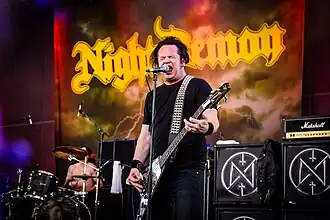 Night Demon is an American heavy metal band from Ventura, California. Performing as a power trio, the band originated from the movement in the 2010s spearheading the resurgence of traditional, old-school heavy metal.[1] Night Demon has released three studio albums on independent record labels,[2] plus a compilation album and a triple-live album recording. The band tours extensively, and regularly performs at venues and heavy metal festivals all around the world.