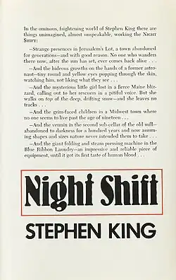 Night Shift is Stephen King's first collection of short stories,[1] first published in 1978. In 1980, Night Shift won the Balrog Award for Best Collection, and in 1979 it was nominated as best collection for the Locus Award and the World Fantasy Award.[2]