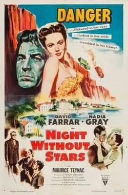 Night Without Stars is a 1951 British black-and-white dramatic thriller film directed by Anthony Pelissier and starring David Farrar, Nadia Gray and Maurice Teynac.[1] The screenplay was by Winston Graham based on his 1950 novel of the same name.[2] The film was produced by Hugh Stewart.[3]