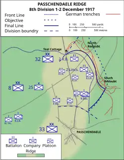 VIII Corps held the right flank of the salient with the 33rd Division on the right and the 8th Division in the centre; II Corps held the left flank with the 32nd Division. At a conference on 18 November, Rawlinson told Jacob, Hunter-Weston and Lieutenant-General Arthur Currie (Canadian Corps), that an operation to take the ground along the ridge as far as Westroosebeke was to be undertaken to broaden the salient. Success would give the British observation over valleys on the north and east sides of the ridge and deprive the Germans of assembly areas on the reverse slope. Planning began for a methodical advance to broaden the salient from Passchendaele to Westroosebeke and Spriet. The 8th Division (Major-General William Heneker) was to conduct an attack on 26 November, to advance 100–300 yd (91–274 m) eastwards on a 1,020 yd (930 m) front and the 32nd Division (Major General Cameron Shute) was to act as a flank guard on the north edge of the salient, by advancing for 400 yd (370 m) on the flanks and 700 yd (640 m) in the centre, on a 1,850 yd (1,690 m) front.[27] The 35th Division to the north was to support the 32nd Division with machine-gun fire.[28]