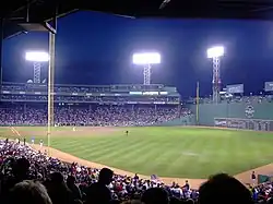An article in the April 1931 edition of Baseball Magazine stated that Independence was the first team in America to play a league night baseball game. After the game in Independence, night baseball "spread like wildfire" across the minor leagues.[4] In addition to that, in 1935, The Sporting News pointed out that Des Moines, Iowa was not the first to install permanent lights, but it was in fact Independence that did so. By the end of the 1934 season there were sixty-five minor league teams with permanent lights installed on their fields.[5] The light towers installed in Independence in 1930 were removed and scrapped in June 1990.[6] Mickey Mantle, an Independence Yankee in 1949, played under the historic lights.