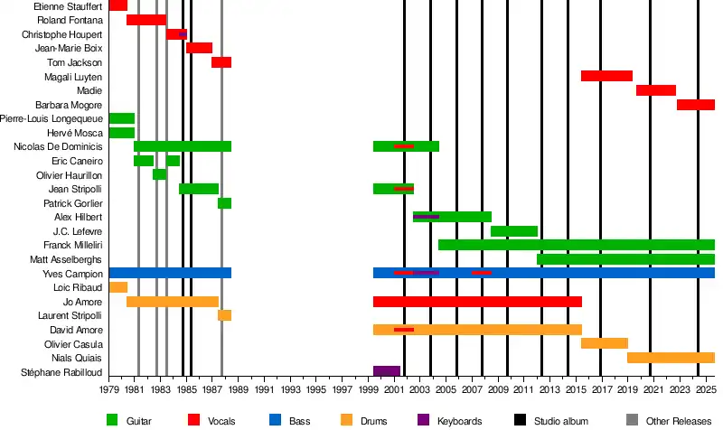 | Past members | Madie Christophe Houpert Jean-Marie Boix Magali Luyten Tom Jackson Nicolas De Dominicis Jean Stripolli Alex Hilbert Stéphane Rabilloud JC "Jess" Lefevre Jo Amore David Amore Olivier Casula |