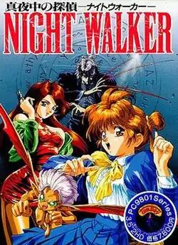 Mayonaka no Tantei Nightwalker (真夜中の探偵 Nightwalker) is a 16-color PC-9801 eroge released by Tomboy in December 1993. Nightwalker is an adventure game, focused mostly on character interaction and problem solving. While the main characters of this game have the same names and similar appearances to their anime equivalents, their personalities are generally more easy-going and their backgrounds are less tragic (they all have living relatives). In comparison to the anime, the game is fairly lighthearted, with Shidō and Guni providing comic relief.