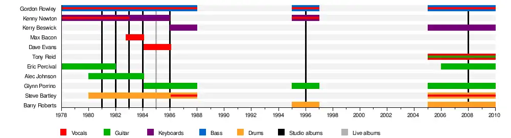 The band's line-up changed fairly consistently since its inception and, at one point, included vocalist Max Bacon (pre-Bronz), who would go on to be in the supergroup GTR and Dave Evans (formerly of the band Days of Grace and not to be confused with the first AC/DC singer of the same name). Some of the band's longer-lasting members include founding members Rowley, Newton and guitarists Alec Johnson and Glynn Porrino and drummer Steve Bartley. Seán Pugh joined the band temporarily as a second keyboard player and vocalist on some dates in the North West leg of the Something in the Air era, including Liverpool Royal Court and Blackpool. However, the experiment was abandoned due to Kenny Newton's reticence to share duties.