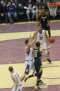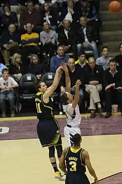 Stauskas began his college career with the expectation that he would be a sharpshooter based on his performance in three-point field goal drills in which he had raised the bar for the team.[27] In the championship rounds of the 2012 NIT Season Tip-Off tournament at Madison Square Garden on November 21 and 23, Michigan defeated Pittsburgh and Kansas State, respectively, to win the tournament.[28][29][30] On November 26, Stauskas earned Big Ten Freshman of the Week honors for his NIT tournament performance in which he averaged 12.5 points and 4.5 rebounds.[31][32][33] On November 27, Michigan defeated its first ranked opponent of the season, NC State (#18 AP Poll/#18 Coaches' Poll), in the ACC–Big Ten Challenge with a then-career-high 20 points from Stauskas in a 79–72 victory.[34] On December 1 against Bradley, Stauskas made his first career regular season start and posted a new career-high 22 points.[35][36] For his first two 20 point performances, he repeated as Big Ten Freshman of the Week on December 3.[37] On December 29, against Central Michigan, Stauskas posted 19 points on 5-for-8 three-point shooting. His 5 three-pointers and 7 rebounds were career-highs, earning him his third Big Ten Freshman of the Week on December 31.[38][39]
