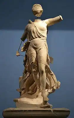 The Nike of Paionios is an ancient statue of the Greek goddess of victory, Nike, made by sculptor Paionios (Paeonius of Mende) between 425 BC and 420 BC. Made of Parian marble, the medium gives the statue a translucent and pure white look to it. Found in pieces, the statue was restored from many fragments but is lacking face, neck, forearms, part of left leg, toes, and some fragments of drapery. It also had wings. The goddess is shown landing gently on her left foot, with the drapery blown against her body.[1]