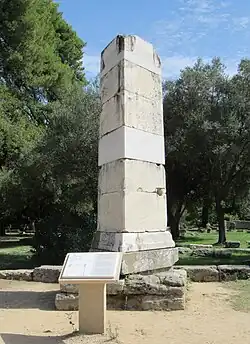 The statue was excavated at Olympia in 1875–76, in the area of Elis, Greece.[6] The statue originally stood near the temple of Zeus on a triangular 6-metre high pillar.[7] It would have been placed at the southwest corner of the temple, above the Sacred Way. The pedestal that this figure would have originally sat on is still in situ in Olympia.[6] Including the pillar, the statue stood at 8 metres, [8] without the pillar the statue stands at 198 cm tall. The placement of this dedicatory statue at Olympia, considered Spartan ground, is most often interpreted by scholars as a deliberate and assertive act of dominance.[9]