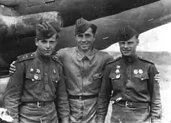 He distinguished himself during the Battle of Berlin in 1945, when he twice led a group of Il-2s to destroy enemy artillery and mortar positions on the southwestern outskirts of Berlin on 24 April. With a well-aimed air strike, the group managed to successfully destroy four artillery batteries.[1][5]