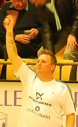 At Kiel, Jacobsen was coached by Croatian coach Zvonimir Serdarušić, and it was here he became one of the best left wingmen in the world.[6] The temperamental Jacobsen was also taught to be a team player, by his new Swedish teammates Magnus Wislander, Staffan Olsson and Stefan Lövgren.[10] When Jacobsen complained that Stefan Lövgren would not play him the ball, Lövgren replied: "When you talk nicely, you will get the ball."[10] Jacobsen and Lövgren soon became close friends.[11] In the following three seasons, Jacobsen scored 1015 goals in a total 142 games for Kiel,[9] as the club won two Handball Bundesliga championships and two German Cup titles. Kiel also finished second in the international 1999–2000 EHF Champions League tournament, losing 52–54 on aggregate to FC Barcelona Handbol in the final.