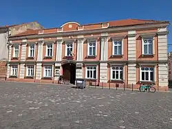 In 1761, the two-storey neoclassical building designed by the architect Heinrich Baader and built by the civil engineer Johann Reiber[7] was initially the Serbian (Rascian) Town Hall, then a forerunner of the German State Theater in Timișoara with German classics on the repertoire.[8] The "waltz king" Johann Strauss II often made guest appearances here,[7] and in 1796 the first performance of Wolfgang Amadeus Mozart's The Magic Flute took place there.