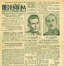 In Russia, Yezhov remains mostly known as the person who was responsible for atrocities of the Great Purge that he conducted on Stalin's orders.[49] Among historians, he also has the nickname "The Vanishing Commissar" because after his execution, his likeness was retouched out of an official press photo; he is among the best-known examples of the Soviet press making someone who had fallen out of favour "disappear".[50]
