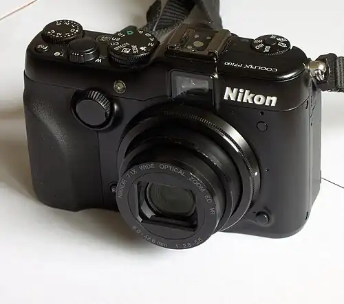 The Nikon Coolpix P7100 is a digital compact camera announced by Nikon on August 24, 2011, successor to the Nikon Coolpix P7000. It differs from the earlier model by an extra control dial, flip-out screen and improved responsiveness.[1]