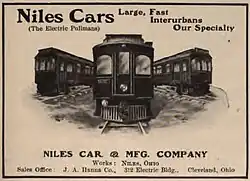 The Niles Car and Manufacturing Company was an American manufacturer of railroad equipment, including many streetcar and interurban cars.[1] It was founded in 1901 in Niles, Ohio and published catalogs showcasing their various cars.[2]