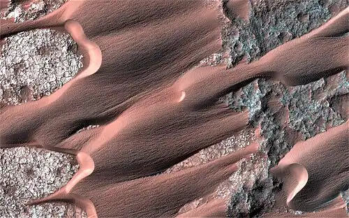 Nili Patera is a dune field on Mars. It is located on top of a lava bed, at the site of an ancient volcano, the Nili Patera caldera of Syrtis Major, near the Martian equator,[1] and it is one of the most active dune fields of Mars. Its location coordinates on Mars are 8.7° N latitude, 67.3° E longitude.[2] It is being actively studied by the HiRISE camera, on board the Mars Reconnaissance Orbiter, at the rate of one image every six weeks. The study of the movement of the dunes provides information regarding wind variation as a function of time and furthers the study of surface erosion characteristics of the Martian landscape. This information can then be used for the development and design of future Mars expeditions.[1][3] The dunes of the Patera field are of the barchan type and their study by HiRISE was the first one to establish dune and ripple movement of a minimum of 1 metre (3 ft 3 in) on Mars.[4] The Patera dune field, was also the first to be investigated using the COSI-Corr software, which was originally developed to analyse the movement of earthbound dunes.[4] The research results from the evidence provided by the monitoring of the Nili Patera field, indicate sand fluxes of the order of several cubic metres per metre per year, similar to the flux observed at the sand dunes of Victoria Valley in Antarctica.[5]