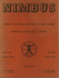 Nimbus: A Magazine of Literature, the Arts, and New Ideas began publication in December 1951 as a quarterly magazine[3] of new writing. Tristram Hull, son of R. F. C. Hull, poet and translator of the Collected Works of C.G. Jung, acted as editor for the magazine's four volumes of thirteen issues. Hull was later joined by co-editors Ivo Jarosy, 1953–1954, and David Wright, 1955–1957[4] and Martin Green (author, 1951–1957) when the magazine was published from Martin's flat: 20 Shipley House, SW8 (Nimbus Issue No.1 Dec 1951) During this period Wright & Green published 19 poems by Patrick Kavanagh, sent to Wright by Patrick Swift, which proved to be the turning point in Kavanagh's career.[5] Due to editorial differences between Wright and Hull, Christopher Logue, in 1957, became co-editor with Hull and the name of the magazine was changed to Nimbus: New English Review.