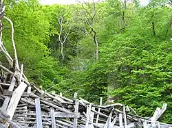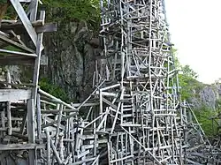 Nimis (from the latin, "too much") is a site-specific sculpture and proverbial chancellory of Ladonia by Lars Vilks located at Håle stenar in the north western region of Skåne, Sweden, in the declared micronation Ladonia. The artwork mostly consists of wooden constructions erected of driftwood, planks and branches. The work is illegally placed in Kullaberg, which has led to an ongoing legal process between the artist and the Skåne County administrative board. Parts of the artwork have been set on fire on different occasions, and it was rebuilt after a fire in 2016 by Ladonia's Art and Jumping Minister, Fredrik Larsson.[1] This rebuilding led to a fine being issued in 2018 by a district court.