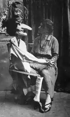 In 1916, volunteering to stage a puppet show for the MTX members, she created a play with five puppets based loosely on the Petrushka folk character.[16][17] Petrushka is a roguish character who is often used to comment on contemporary society's social vices.[18] The show was well received. She presented a repeat performance before receiving an invitation to stage the play once more at the Café Pittoresque, a well-known cabaret. Having lost her jester-like puppet, she wrote two new plays and performed them with her husband.[16][17] They were adaptations of Ivan Krylov's fables The Hermit and the Bear and Two Mice.[17] She gave several other performances with her husband, at cafés, friends' homes and at the Hermitage Theatre between 1916 and 1918.[19]