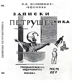 Wishing to complement her involvement in performance, Simonovich-Efimova began publishing works "to establish puppetry's validity as a unique discipline" within the visual arts realm. She published books and pamphlets on design and movement, including a history of the art and descriptions of the contributing puppeteers. One of her best known works, Notes of a Petrushkanist (Russian: Записки петрушечника, 1925) gives details of her performances and theories, together with drawings and texts of her plays.[22] In 1930, she spoke at the first USSR Soviet Puppet Theaters Conference presenting her ideas on puppetry.[24] She disavowed claims that puppets are lifeless automatons, maintaining that the puppeteer must convince the audience they are alive. The artistry in creating vitality involved an intimate connection between puppet and puppetmaster, a feat she felt could not be achieved in the same way with marionettes.[25] She viewed the connection between manikin and manipulator as symbiotic collaboration: rather than the puppeteer forcing choreography upon the puppet, the doll's limitations helped the puppeteer learn to communicate in new ways.[26] The lack of facial expressions must be compensated by gesture. Unlike an actor who interacts with other performers, the puppet communicates both with the other actors and the puppetmaster himself.[27]