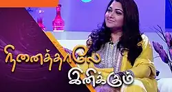 Ninaithale Inikkum is an Indian Tamil-language television talk show, which aired for 22 episodes on Vendhar TV from 30 August 2014 to 5 April 2015 on every Sunday at 12:00PM IST. The talk show was presented by Tamil cinema actress Khushboo Sundar.[1][2] The show features many segments including a whacky self indulging make-up by the celebrities, surprise guests either from the celebrity's family or friends, shopping, and many more.