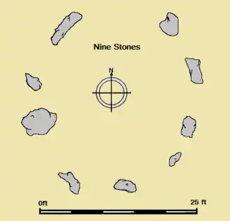 The Nine Stones circle has been described by Gale as "probably the most well documented of all those surviving in the county".[2] It measures 9.1 by 7.9 metres (29 feet 10 inches by 25 feet 11 inches) in diameter, as measured from a north-to-south direction.[25] The stones are of sarsen or conglomerate.[25][26] A gap between two stones on the side of the circle adjacent to the road may suggest that there was once a tenth stone in the monument.[27] Given its dimensions, the circle could only accommodate a small number of individuals assembling within it.[28]
