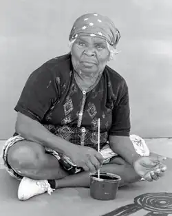 After her husband's death in 1998, the volume of paintings she produced increased.[2] Her style is reminiscent of some of Tjungurrayi's work, but her subject - women's lives and experiences and their role in mythology – differs.[2][8] Comparisons have been drawn between her work and that of other Papunya Tula artists, such as Makinti Napanangka and Inyuwa Nampitjinpa.[2] Her status not just as an artist, but as a guardian of cultural heritage meant she was highly regarded in her community and beyond in her lifetime.[9] The palette she used and the way the paint is layered on the canvas is seen as reminiscent of how body paint is used by women in ceremonial activities.[10]
