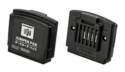 The Jumper Pak[b] (NUS-008) is a filler module that plugs into the Nintendo 64's memory expansion port.[12] It serves no functional purpose beyond terminating the RDRAM (Rambus DRAM) bus when the Expansion Pak is not installed.[13]