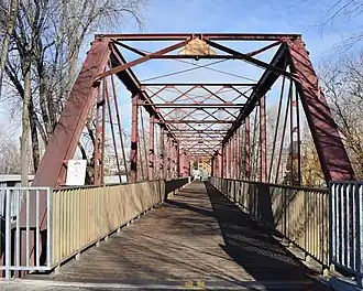The Ninth Street Bridge in Boise, Idaho, also known as the Eighth Street Bridge, crosses the Boise River and is a 2-span, pin-connected Pratt through truss design constructed by the Missouri Valley Bridge & Iron Co. and completed in 1911. Each span is 160 ft (49 m) and includes six full panels and two end panels, supported by concrete piers at each end and midway in the river. Laced channel sections with cover plates form the upper chords, with eyebars on the lower chords. Eyebars with turnbuckles form the diagonals. The bridge was added to the National Register of Historic Places in 2001.[2]