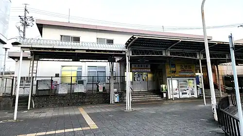 Nishi-Kuwana Station (西桑名駅, Nishi-Kuwana-eki) is a passenger railway station located in the city of Kuwana, Mie Prefecture, Japan, operated by the private railway operator Sangi Railway. The station is immediately adjacent to Kuwana Station, which services the Kansai Main Line, Kintetsu Nagoya Line and the Yōrō Line. The station is used primarily by morning and evening commuters to school and work. Many passengers proceed on to Nagoya and Yokkaichi via Kintetsu and JR at Kuwana Station.