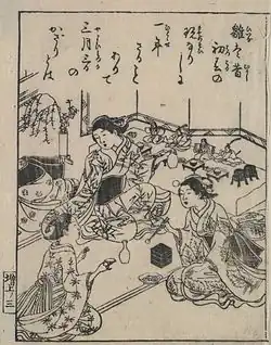 Nishikawa Sukenobu (西川 祐信; 1671 – August 20, 1750), often called simply "Sukenobu", was a Japanese printmaker from Kyoto. He was unusual for an ukiyo-e artist, as he was based in the imperial capital of Kyoto. He did prints of actors, but gained note for his works concerning women. His Hyakunin joro shinasadame (Appreciating 100 women), in two volumes published in 1723, depicted women of all classes, from the empress to prostitutes, and received favorable results.