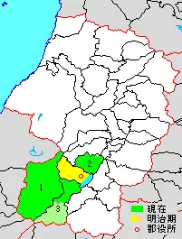 yellow & dark green area=original extent in early Meiji period; light green=area added in Showa period; green=present area; 1=Oguni; 2=Shirataka; 3=Iide