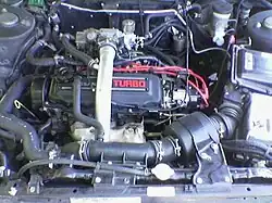 The 1.8 L (1,809 cc) CA18ET was produced from 1984 through 1992. It is a turbocharged version of the CA18E, which produces 99 kW (135 PS; 133 hp) and 183 N⋅m (135 lb⋅ft) from a single Garrett T2 turbocharger which did not feature an intercooler. The low-pressure turbo has a 0.6 bars (8.7 psi) overcharge.[2] The engine has fuel and air delivered via ECCS Multiport Fuel Injection, a system developed together with Hitachi.