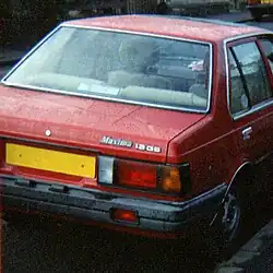 The first car to wear the Maxima name, the second-generation Datsun 810, was introduced in 1980 for the 1981 model year. It was essentially a Japanese-market Datsun Bluebird (910) with the wheelbase extended 3.9 in (100 mm) to accommodate the inline-six engine. This model replaced the Datsun 810 (first generation). The second-generation Datsun 810 was not marketed in Japan, only in North America as the lower trim Datsun 810 Deluxe and upper trim 810 Maxima.[3] Both were available with either sedan or wagon bodywork.[4] In 1981 for the 1982 model year, all 810s were rebranded as Datsun Maxima. In 1983 for the 1984 model year, the last year of the first-generation Maxima, North American Datsuns began carrying the "Nissan" badge as well. Only 1984 model year Nissans have rear "Nissan" and "Datsun" badges, although earlier models had a "Datsun" badge with a small "by Nissan" designation below.
