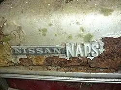 NAPS (Nissan Anti Pollution System)[1] is a moniker used in Japan to identify vehicles built with emission control technology. The technology was installed so that their vehicles would be in compliance with Japanese Government emission regulations passed in 1968. The term was first introduced in Japan, with an externally mounted badge on the trunk of vehicles equipped. Nissan's implementation began with the Y44E V8 engine installed in the Nissan President along with all vehicles installed with the Nissan L engine and the Nissan A engine in 1975. The initial introduction of Nissan's technology was the installation of an exhaust gas recirculation valve, followed with the addition of a catalytic converter and an air pump that added oxygen into the exhaust to promote higher temperatures in the catalytic converter, thus cleaning the exhaust further.