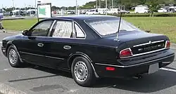 In October 1989, the third-generation President, designated JHG50, debuted at the Tokyo Motor Show, with sales beginning a year later. Concurrently, a short-wheelbase version of the chassis PHG50 debuted in the United States as Infiniti Q45 or Nissan Infiniti Q45 in Japan, without a grille as a visual difference to the 1989 Lexus LS and the 1985 Acura Legend. As a result of Project 901, there was a renewed emphasis on positioning the President as a senior corporate luxury limousine with high levels of standard equipment, including Connolly Leather or a combined wool and silk blend upholstery. Extras included a diamond inlay on the key, gold plate hood ornament and rear badging, and ultrasound massage in the rear seats. Vehicles could be optionally equipped with Full-Active Suspension (JHG50 or PHG50) or conventional coil suspension (JG50 or PG50) while a multi-link suspension was used at all four wheels,[6] similar to the Nissan Laurel (C33).[7][8] This time the vehicle adopted many European styling cues, with its front now resembling the contemporary Jaguar XJ. Unlike the previous, hand-made generations, this was the first President built on an assembly line.[2]