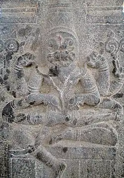 According to legend, Vishnu's gatekeepers Jaya and Vijaya are cursed by sages that they would be born as asuras during their next birth. They were born on earth as Hiranyaksha and Hiranyakashipu to sage Kashyapa and his wife Diti. The demon brothers on account of their powers, take control of the universe. The elder brother Hiranyaksha practices penance and obtains a boon from Brahma which makes him invincible by any animal or human. Hiranyaksha captures earth, personified as goddess Bhudevi and hides her under the Causal Ocean called Garbhodhaka. All the celestial deities and sages went to Vishnu for rescue. Since Hiranyaksha did not include the boar in the list of animals that can slay him, Vishnu assumes this form with huge tusks and goes down to the primordial ocean. Hiranyaksha obstructs Varaha and the pair having a strong duel. Varaha lifts the earth on his tusks, which would go on to be the most common figurine representation of Varaha. The two fought each other with their mace, with Varaha emerging victorious after a thousand-year duel. Varaha emerges from the Causal Ocean with the earth in his tusks and repositions her in her original spot. The earth goddess Bhudevi falls in love with Varaha, whom he is believed to have taken in his lap in this place. A number of maidens awaited to marry the divine looking boar Varaha. As per the wish of sage Kalava, who wanted Vishnu to marry his 360 daughters. Varaha married the 360 daughters one per day during the course of the whole year. Since he is believed to marry maidens daily, he came to be known as Nithyakalyana Perumal (meaning the deity who marries for eternity).[2]