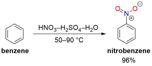 Nitrobenzene is prepared by nitration of benzene with a mixture of concentrated sulfuric acid, water, and nitric acid. This mixture is sometimes called "mixed acid."