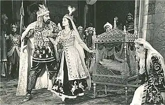 The part of Nizami in the opera represents the great poet in arias and arioso as a noble man who loves his people and the hometown.[15] His aria, in the fourth act, is one of the expressions of these feelings.[14][16] The part of Nizami was masterfully performed by Murtuza Mamedov. This performance has been repeatedly noted in the press.[14] Nizami's aria performed by Bulbul and conducted by Niyazi was included in the program of the gala concert dedicated to the 800th anniversary of Nizami Ganjavi held on 27 September 1947.[17][18]