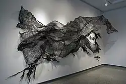 Nnenna Okoreⓘ (born 1975 in Canberra, Australia) is an Australian-born Nigerian artist who lives and works in Chicago at North Park University, Chicago.[1][2] Her largely abstract sculptural forms are inspired by richly textured forms and colours within the natural environment.[3] Okore's work frequently uses flotsam or discarded objects to create intricate sculptures and installations through repetitive and labor-intensive processes.[4] She learnt some of her intricate methods, including weaving, sewing, rolling, twisting and dyeing,[5] by watching local Nigerians perform daily domestic tasks.[1] In her more recent works, Okore uses plant-based materials (in particular, food scraps and food waste) to create large bioplastic art forms and installations.[6] Her work has been shown in galleries and museums within and outside of the United States.[1][5][7][8] She has won several international awards, including a Fulbright Scholar Award in 2012.[9] and the Australian Creative Victoria Award in 2021.[10]