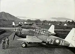 No. 77 Wing formed the attack component of No. 10 Operational Group (No. 10 OG), which was established on 13 November 1943. The group was to act as a mobile strike force capable of supporting Allied ground and naval units while they advanced against the Japanese in the South West Pacific Area (SWPA), as distinct from the RAAF's area commands in Northern Australia, which had a geographically based static defence function.[1][2] Led by Wing Commander E.G. Fyfe, No. 77 Wing consisted of three flying squadrons operating Vultee Vengeance dive bombers, and various ancillary units. The Vengeances, which had only recently been acquired by Australia, equipped Nos. 21, 23 and 24 Squadrons. They were to be protected on their attack missions by No. 10 OG's fighter component, No. 78 Wing, operating Curtiss Kittyhawks.[3]