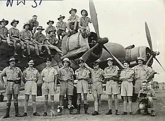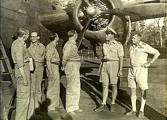 ![]() Commanders of No. 18 (NEI) Squadron and No. 79 Wing: Lieutenant Colonel Asjes (second right) and Group Captain Ryland (far right) at Batchelor, Northern Territory, 1944 | |