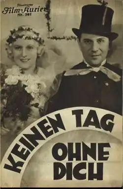 No Day Without You (German: Keinen Tag ohne Dich) is a 1933 German comedy film directed by Hans Behrendt and starring Lee Parry, Oskar Karlweis, and Paul Hörbiger.[1] It was shot at the Johannisthal Studios in Berlin.