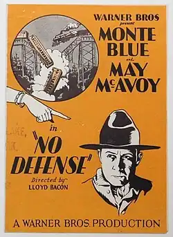No Defense is a 1929 American sound part-talkie romantic drama film directed by Lloyd Bacon and starring Monte Blue. In addition to sequences with audible dialogue or talking sequences, the film features a synchronized musical score and sound effects along with English intertitles. The soundtrack was recorded using the Vitaphone sound-on-disc system. According to the film review in Variety, 60 percent of the total running time featured dialogue.[1] The film was distributed by Warner Brothers.[2][3]