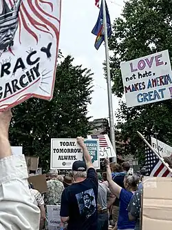 A protest took place in Topeka at the Kansas State Capitol, attracting an estimated crowd of over 2,000 people.[150][151][152] Other protests took place in Great Bend,[153] Hays,[154] Lenexa,[155][156] Garden City,[151] Lawrence,[157][158] Wichita[159] and Pittsburg.[160]